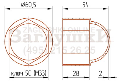 Колпачок под болт/гайку М33 или размер ключа 50 мм. В основном используется для того, чтобы закрыть крепежи во фланцах. Удобен для применения в случае, когда необходимо сохранить резьбу крепёжных элементов: надевается на болт/гайку, защищая от повреждений выходящий резьбовой стержень. Благодаря этому в дальнейшем конструкцию можно демонтировать.
