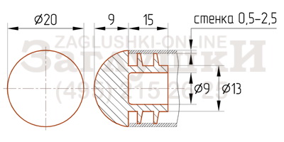Внутренняя заглушка для металлических и хромированных труб диаметром 20 мм. Имеет рёберную конструкцию заходящей части и подходит для труб со стенкой 0,5-2,5 мм. Отлита из высокопрочного пластика, благодаря чему отличается устойчивостью к механическим повреждениям. Вставляется в торец трубы и забивается киянкой или другим подобным инструментом.