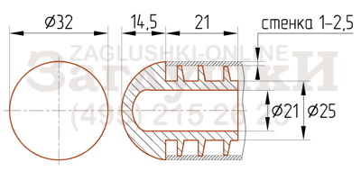 Пластиковая внутренняя заглушка для металлических и хромированных труб диаметром 32 мм. Имеет рёберную конструкцию заходящей части и подходит для труб со стенкой 1-2,5 мм. Заглушка имеет толстую шляпку сферической формы и может использоваться как опора для труб, находящихся под углом относительно пола. Популярна для торгового оборудования и мебели на металлическом каркасе.
