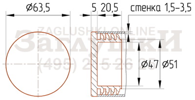 Пластиковая заглушка для металлических и хромированных труб диаметром 63,5 мм. Подходит для труб со стенкой 1,5-3,5 мм. Монтируется с помощью киянки или другого подобного инструмента. Имеет три ряда боковых рёбер и отлично держится в торце трубы, защищая от попадания внутрь влаги и пыли. Отливается в чёрном, сером и белом цвете, а также под заказ в любом цвете по RAL.