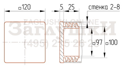 Внутренняя заглушка для металлических и хромированных труб квадратного сечения 120х120 мм. Имеет рёберную конструкцию заходящей части, благодаря чему подходит для труб с толщиной стенки 2,5-7 мм. В основном используется для ограждений и заборов. Вставляется в торец трубы и забивается киянкой или другим подобным инструментом. Надёжно фиксируется, придавая металлоконструкции завершённый и аккуратный вид.