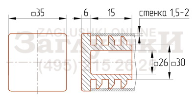 Внутренняя заглушка для металлических и хромированных труб квадратного сечения 35х35 мм. Имеет рёберную конструкцию заходящей части и подходит для труб с толщиной стенки 1,5-2 мм. Заглушка отлита из высокопрочного пластика, благодаря чему изделие отличается устойчивостью к механическим повреждениям и перепадам температуры. Не выцветает на ярком солнце и не трескается под воздействием морозов. Легко монтируется с помощью киянки или другого подобного инструмента.