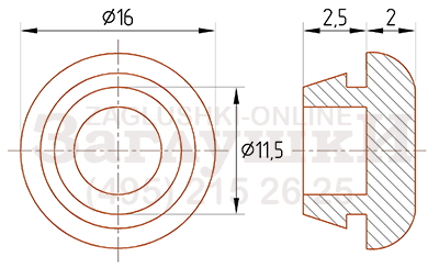 Подпятник для металлических и хромированных труб. Имеет круглую плоскую шляпку диаметром 16 мм. Подходит под отверстие диаметром 11,5 мм. Монтируется с помощью киянки или другого подобного инструмента. На нижней части изделия предусмотрены насечки антискольжения. Подпятник аккуратно смотрится и не царапает напольное покрытие.