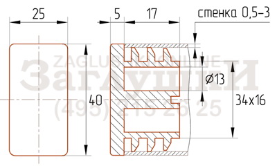 Пластиковая внутренняя заглушка для профильных труб 25х40 мм. Имеет рёберную конструкцию заходящей части и подходит для труб с толщиной стенки 0,5-3 мм. Используется для ограждений, заборов, систем торгового оборудования и мебели на металлическом каркасе. Монтируется с помощью киянки или другого подобного инструмента. Надёжно фиксируется, защищая от попадания внутрь трубы пыли и влаги.