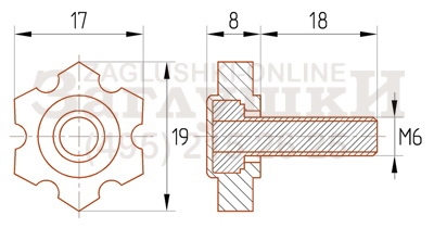 Резьбовая опора М6х18 мм. Имеет шестигранное основание 19 мм. Предназначена для регулировки небольших мебельных конструкций по высоте. В основном приобретается в комплекте с забивной, «усовой» гайкой или заглушкой с соответствующим размером резьбы. Благодаря шестигранному основанию может регулироваться как вручную, так и с помощью гаечного ключа.