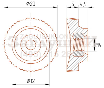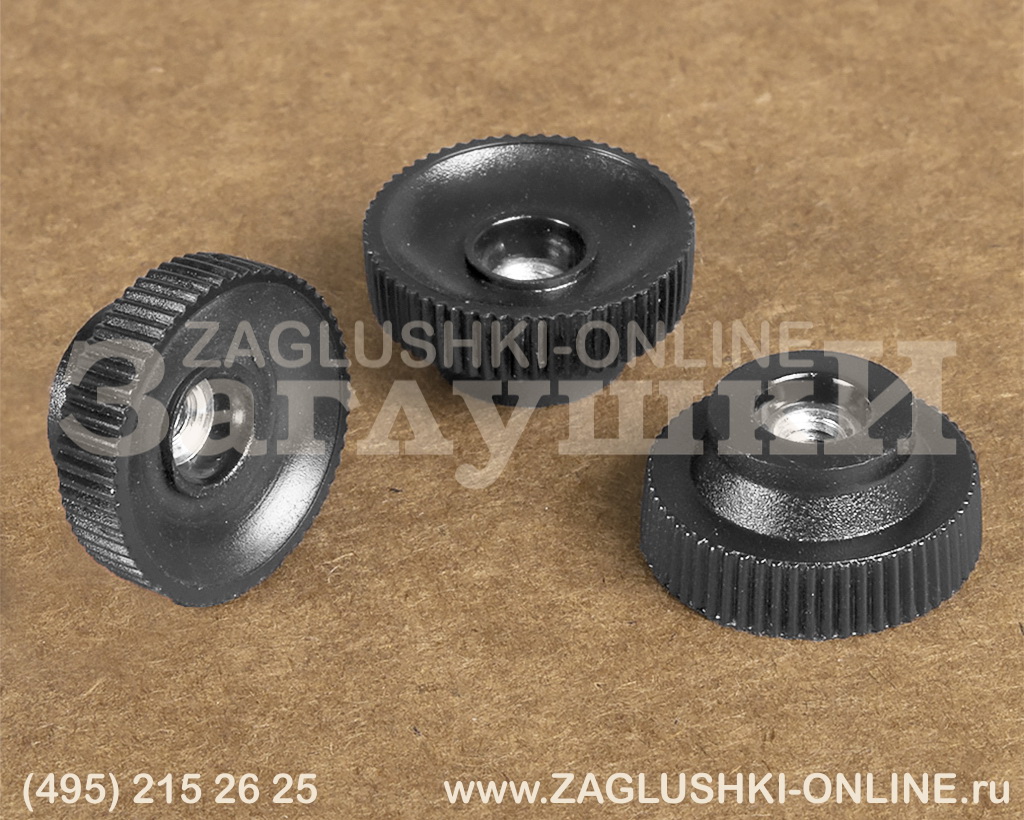 Ручка-гайка с резьбой М4. Диаметр изделия — 20 мм. Используется для фиксации изделий в определённом положении. Имеет рифлёное основание, за счёт чего удобно вкручивается. Отливается в чёрном, сером и белом цвете, а также под заказ в любом цвете по каталогу RAL.