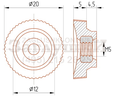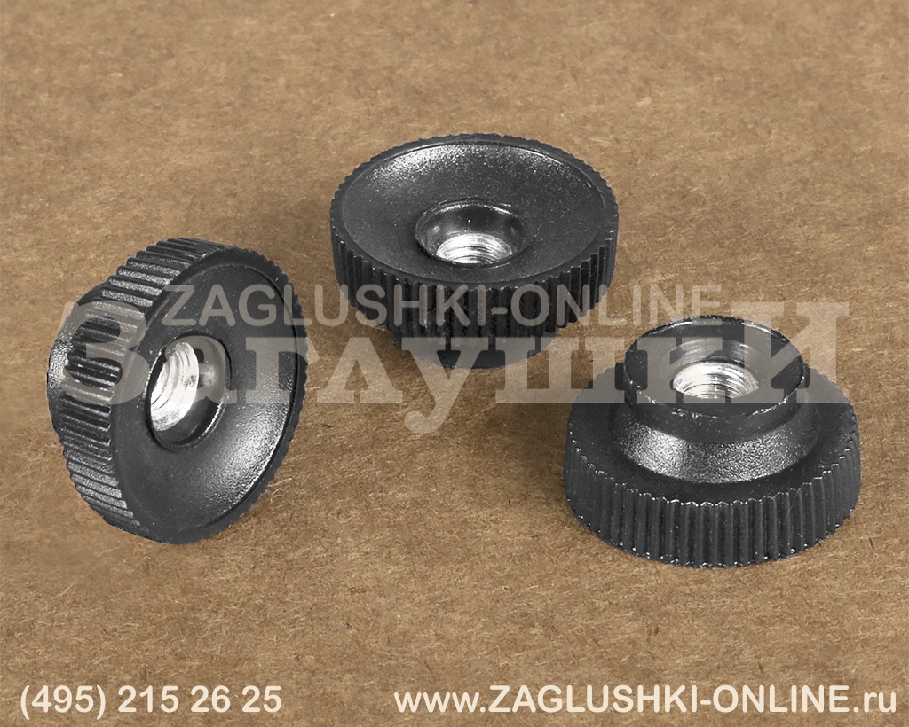 Ручка-гайка с резьбой М5. Диаметр изделия — 20 мм. Используется для фиксации медицинского, торгового и офисного оборудования. Накручивается на резьбовую шпильку вручную. Для удобной фиксации на основании ручки-гайки предусмотрены насечки. За счёт сквозного отверстия может использоваться с резьбовым стержнем любой длины.