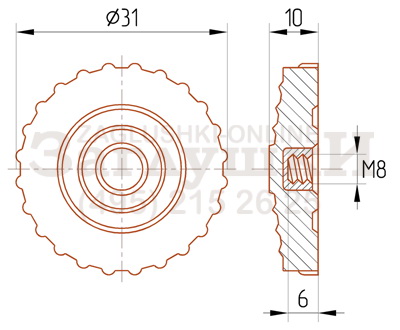 Ручка-гайка с резьбовым отверстием М8. Имеет лепестковую форму рукоятки. Диаметр изделия — 31 мм. Используется для фиксации торгового, медицинского оборудования (например, для медицинских инструментальных столов), осветительных приборов (для настольных ламп), для фотооборудования. Накручивается на резьбовую шпильку вручную.