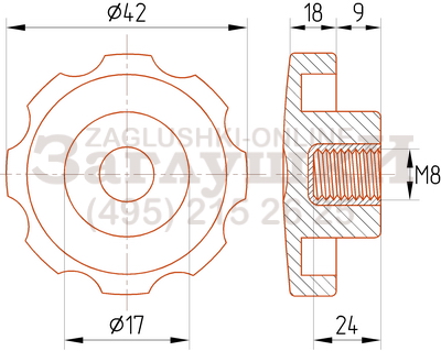 Ручка-фиксатор с пластиковой лепестковой рукояткой диаметром 42 мм и резьбовым отверстием M8.