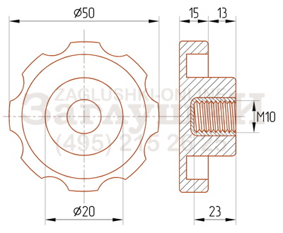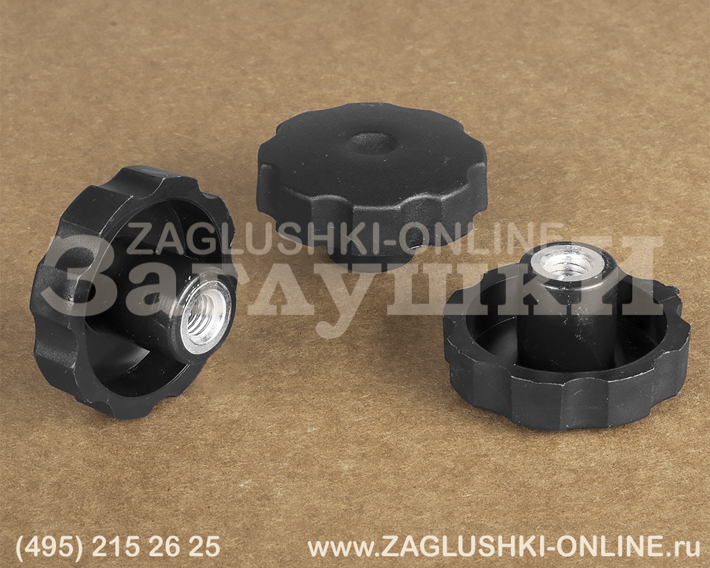 Ручка-гайка с резьбой М10. Диаметр изделия — 50 мм. Предназначена для фиксации медицинского, производственного оборудования. За счёт лепестковой формы рукоятки удобно и быстро накручивается на резьбовую шпильку. Может использоваться в комплекте с ручкой-винтом, имеющей соответствующую резьбу.