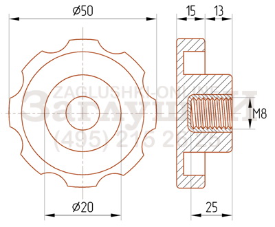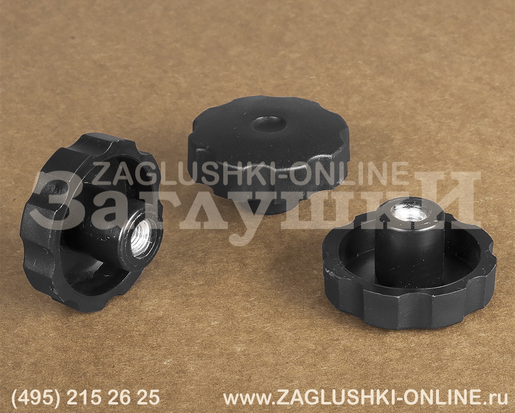 Ручка-гайка с резьбой М8. Диаметр изделия — 50 мм. Используется для фиксации производственного, медицинского оборудования. Популярна для медицинских столов, фототехники (штативов), осветительного оборудования. Имеет лепестковую форму рукоятки, удобно накручивается на резьбовую шпильку. Отливается как в стандартных цветах: чёрном, сером, белом, так и под заказ в любом цвете по RAL.