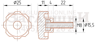 Ручка-винт с резьбовым стержнем М8х22 мм. Диаметр рукоятки изделия — 25 мм. Предназначена для фиксации фототехники, осветительного, производственного оборудования. Также используется в медицинском оборудовании (в столах, колясках). Легко вкручивается за счёт лепестковой формы рукоятки. Аккуратно и эстетично смотрится.