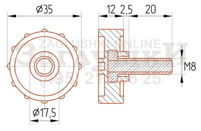 Ручка-винт с резьбой М8х20 мм. Диаметр рукоятки изделия — 35 мм. Используется для фиксации торгового, офисного, медицинского оборудования. Для удобного вкручивания предусмотрена удобная рукоятка. Отливается как в стандартных цветах: чёрном, сером, белом, а также под заказ в любом цвете по каталогу RAL.