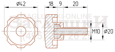 Ручка-винт с резьбовым стержнем М10х20 мм. Диаметр рукоятки изделия — 42 мм. Предназначена для фиксации фототехники, осветительного, производственного оборудования. Также используется в медицинском оборудовании (в столах, колясках). Легко вкручивается за счёт лепестковой формы рукоятки. Аккуратно и эстетично смотрится.