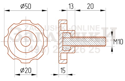 Ручка-винт с резьбовым стержнем М10х20 мм. Диаметр рукоятки изделия — 50 мм. Рукоятка отлита из высокопрочного пластика, благодаря чему изделие устойчиво к механическим повреждениям и перепадам температуры. Ручка-винт используется в производственном и медицинском оборудовании. Изделие легко вкручивается за счёт удобной рукоятки и аккуратно смотрится.
