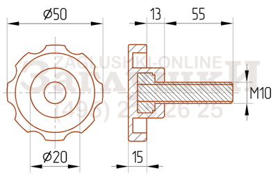 Ручка-винт с пластиковой лепестковой рукояткой диаметром 50 мм. Имеет металлическую оцинкованную резьбу М10х55 мм. Предназначена для фиксации производственного, медицинского оборудования. Также применяется в фототехнике. Легко вкручивается за счёт удобной формы рукоятки. Может использоваться в комплекте с ручкой-гайкой, имеющей резьбу М10.