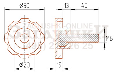 Ручка-винт с резьбовым стержнем М6х40 мм. Диаметр рукоятки изделия — 50 мм. Предназначена для фиксации фототехники, осветительного, производственного оборудования. Также используется в медицинском оборудовании (в столах, колясках). Легко вкручивается за счёт лепестковой формы рукоятки. Аккуратно и эстетично смотрится.