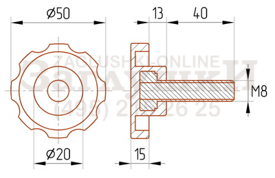 Ручка-винт с резьбовым стержнем М8х40 мм. Диаметр рукоятки изделия — 50 мм. Предназначена для фиксации производственного, медицинского, торгового оборудования. Легко вкручивается за счёт лепестковой формы рукоятки. Аккуратно смотрится. Для удобного выбора изделие отливается в чёрном, сером и белом цвете. Под заказ возможно изготовление в любом цвете по RAL.
