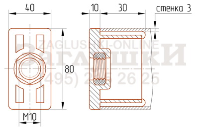 Внутренняя заглушка с металлической резьбой М10. Подходит для труб прямоугольного сечения 40х80 мм с толщиной стенки 3 мм. Предназначена для регулирования металлоконструкции по высоте. Используется в комплекте с резьбовой опорой. Монтируется с помощью киянки или другого подобного инструмента.