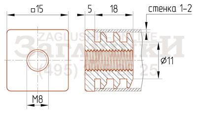 Внутренняя заглушка для труб квадратного сечения 15х15 мм. Подходит для труб с толщиной стенки 1-2 мм. Изделие имеет пластиковую резьбу М8. В основном используется в комплекте с резьбовой опорой для регулирования металлоконструкции по высоте. Монтируется с помощью киянки или другого подобного инстумента. Сначала в торец трубы забивается заглушка, затем в неё вкручивается опора, благодаря которой осуществляется регулировка.