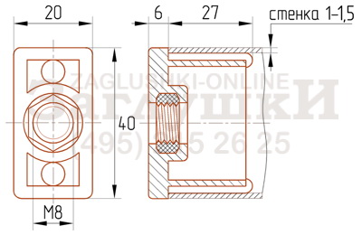 Внутренняя заглушка с металлической резьбой М8. Предназначена для металлических и хромированных труб прямоугольного сечения 20х40 мм. Имеет ребёрную конструкцию заходящей части и подходит для труб с толщиной стенки 1-1,5 мм. Используется для регулирования металлоконструкции по высоте. Как правило, приобретается в комплекте с регулируемой опорой.