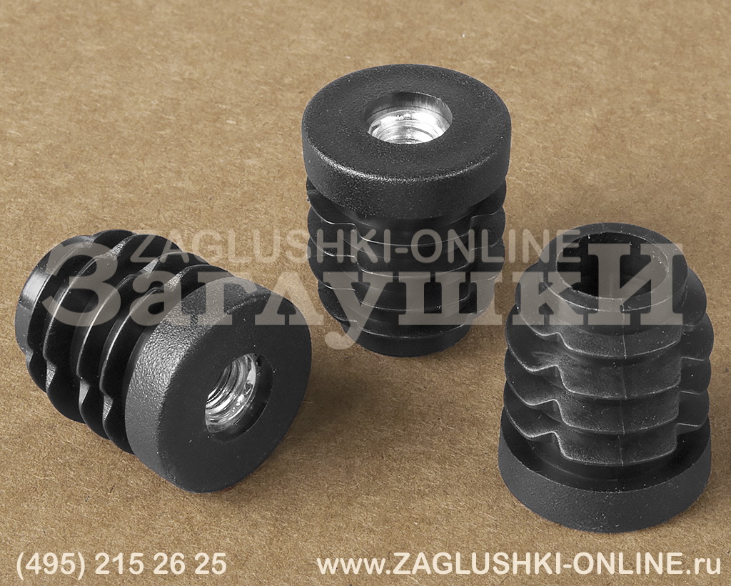 Пластиковая внутренняя заглушка для металлических и хромированных труб диаметром 25 мм. Внутрь заглушки залита гайка с резьбой М8. Изделие имеет рёберную конструкцию заходящей части и подходит для труб со стенкой 1-2 мм. В основном используется в комплекте с резьбовой опорой для регулирования металлоконструкции по высоте.