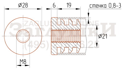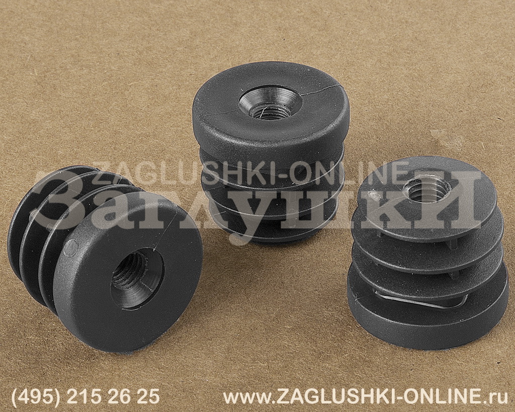 Пластиковая внутренняя заглушка для металлических и хромированных труб диаметром 28 мм. Имеет пластиковую резьбу М8. Отличается рёберной конструкцией заходящей части, за счёт чего подходит для труб со стенкой 0,8-3 мм. Изделие достаточно просто монтируется: заглушка вставляется в торец трубы и забивается киянкой. Как правило, используется в комплекте с резьбовой опорой для регулирования металлоконструкции по высоте.