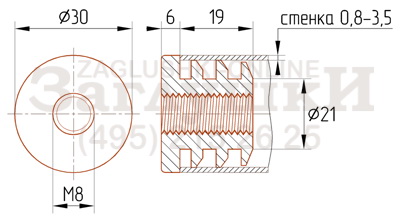 Внутренняя заглушка с пластиковой резьбой М8. Предназначена для металлических и хромированных труб диаметром 30 мм. Заглушка имеет рёберную конструкцию заходящей части и подходит для труб со стенкой 0,8-3,5 мм. Отличается толстой шляпкой 6 мм. В основном используется в комплекте с резьбовой опорой для регулирования металлоконструкции по высоте.